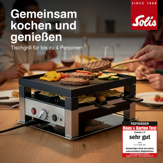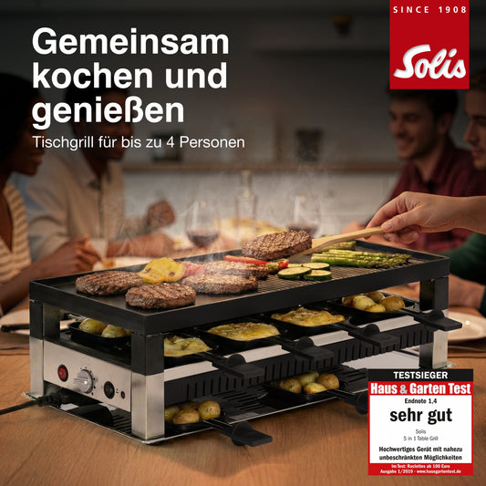 Solis 5 in 1 Raclette Tischgrill, 1020 W, 4 Personen, Mini Pizza Mini Wok Crepes B-Ware