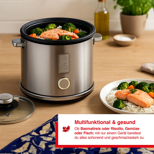 Solis Reiskocher & Dampfgarer, 850 W, 5L Volumen, 3D Heizsystem, Timer, Display B-Ware
